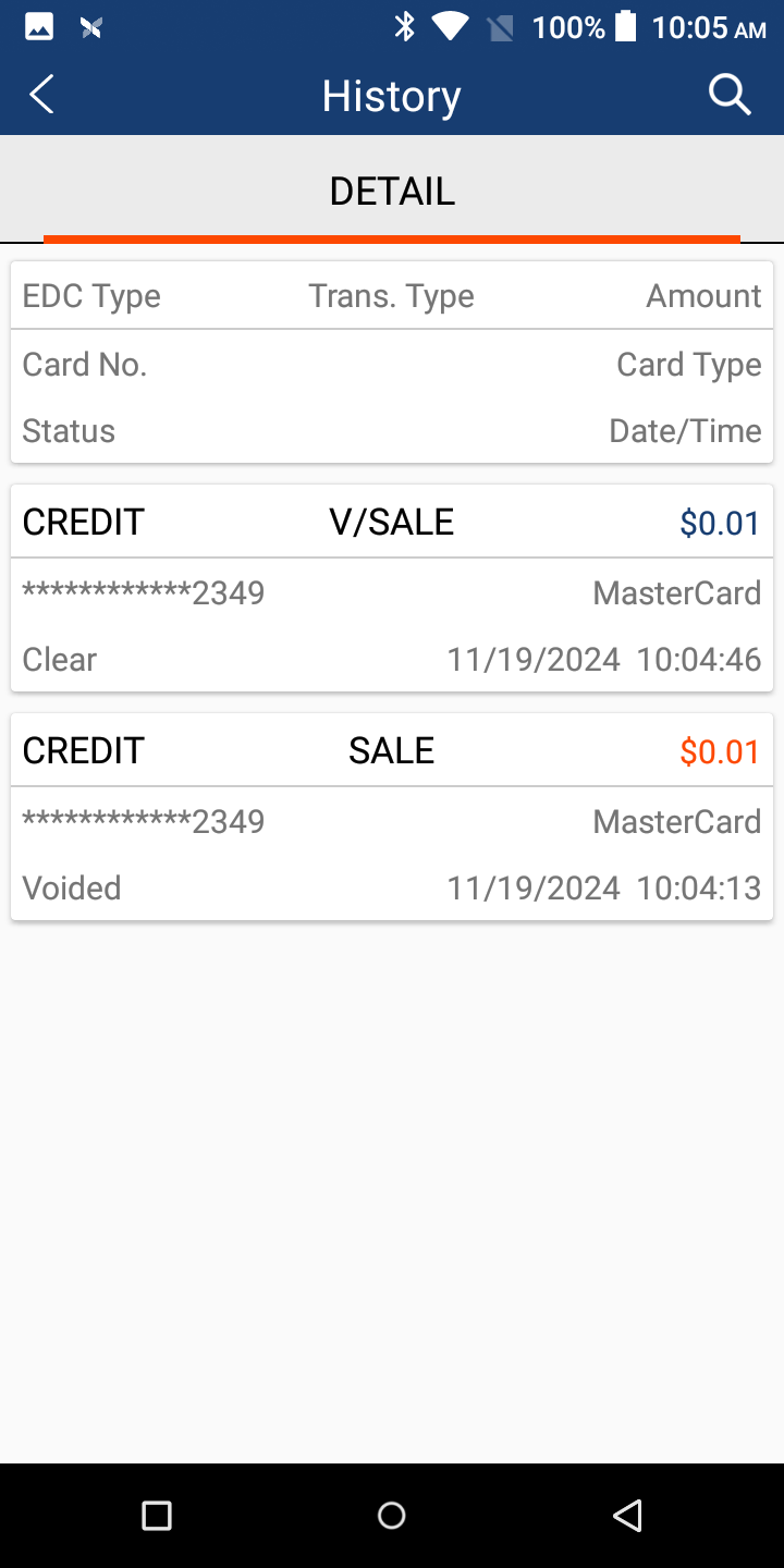 Once that password is entered, it will go to the list of all of the open transactions on the batch currently. Keep in mind that all Sales will be colored in Red and any Voids will be in Blue.