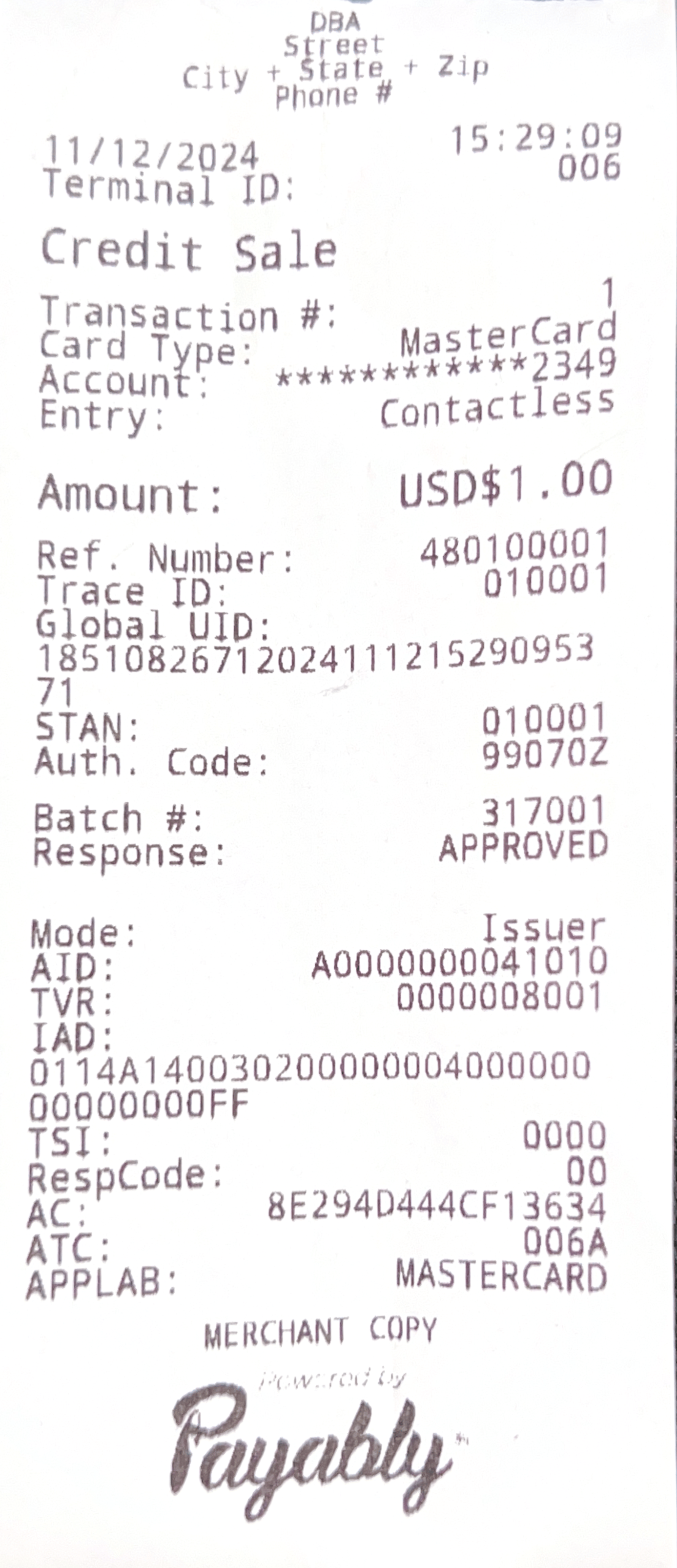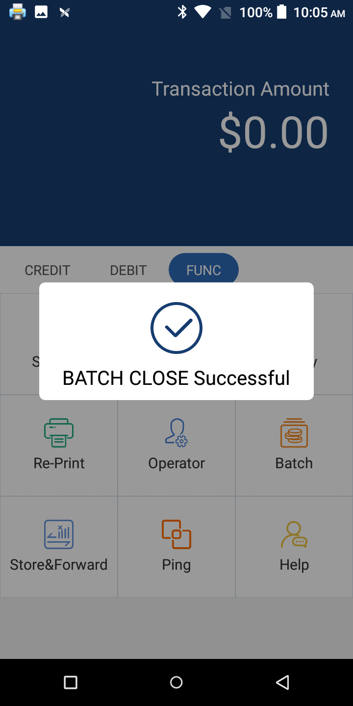 If everything gets processed correctly, a confirmation will be shown on screen and print a batch report containing all transactions: