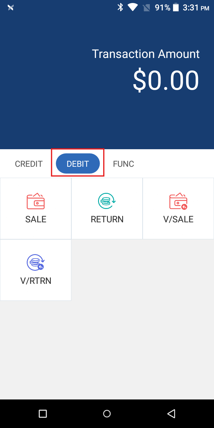 The same functions in the Credit tab will be available in the Debit tab. The only functional difference is that Debit transactions will require the customer to enter the PIN. Additionally, the processing rates for PIN Debit will always be lower when compared to Credit transactions.