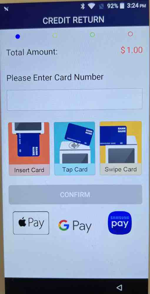 Then, it will take you to the Return screen. In here, the card can be used physically there with Chip/Tap OR be manually entered in that box in the middle of the screen. To do a manual entry refund, keep in mind that the full card number and expiration date will be the only required info needed.